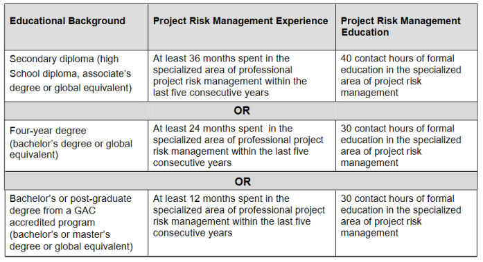 The Project Management Institute (PMI)® offers a professional credential for project risk managers, known as the PMI Risk Management Professional (PMI-RMP) ®. PMI’s professional credentialing examination development processes stand apart from other project management certification examination development practices. PMI aligns its process with certification industry best practices, such as those found in the Standards for Educational and Psychological Testing. A key component of this process is that organizations wishing to offer valid and reliable professional credentialing examinations are directed to use a role delineation study (RDS) as the basis for the creation of the examination. This process uses knowledge and task-driven guidelines to assess practitioner competence, and determine the level of salience, criticality, and frequency of each of the knowledge, tasks, and skills required to perform to the industry-wide standard in the role of a project risk manager.